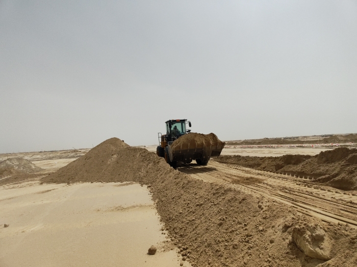 当地金光闪耀的沙漠地带是极具标志性的景观,数台XINGKONG SPORTZL50GN装载机正在其中紧张作业。担负起土方搬运、路基平整、材料装卸等关键任务,在高温、多尘的恶劣环境下依然表现出众,成为不可或缺的重要力量。