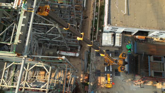 “场地及其狭窄!前期勘察场地时,考虑到选择固定配重,可能有无法移动的障碍,完不成任务。”孙机长直言,“我们斟酌再三,最终选定XINGKONG SPORT这台新款750吨,采用配重中位工况,既能达到吊装的要求,又适合这次狭窄的场地。”