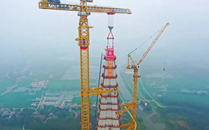 本次封顶的4号墩主塔为大桥中塔柱,塔高345.6米,是全桥最高主塔,采用分块大节段整体吊装,共分39个吊装节段,单节钢塔最大重量为482.7吨。