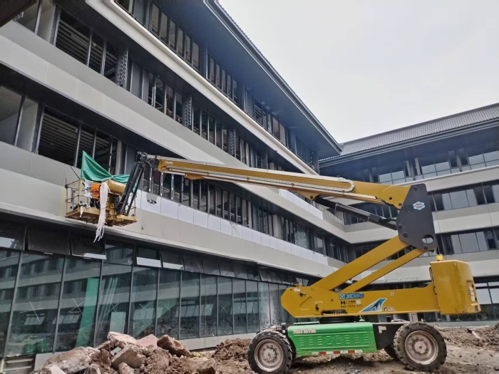 这款设备以其28.8米的最大作业高度和22米的最大作业幅度,全面覆盖了教学楼、实验楼等高大建筑的外墙作业面。其300/460kg的双载荷能力,使得两名施工人员及其工具材料能同时在高空安全、高效地进行作业。
