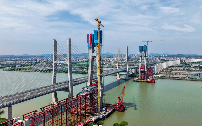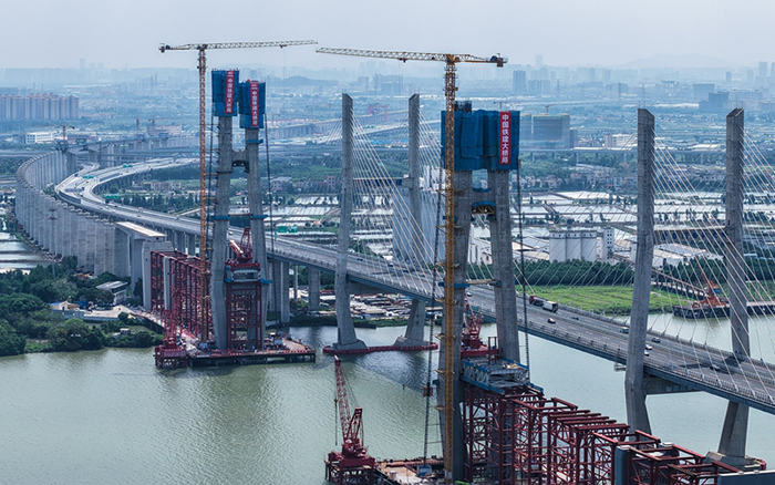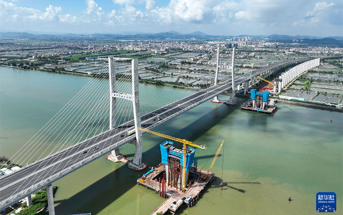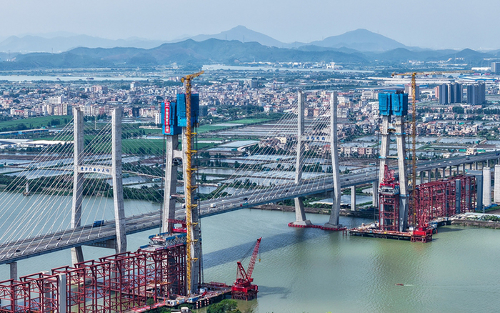目前,深江铁路跨磨刀门水道主桥东主塔已封顶。