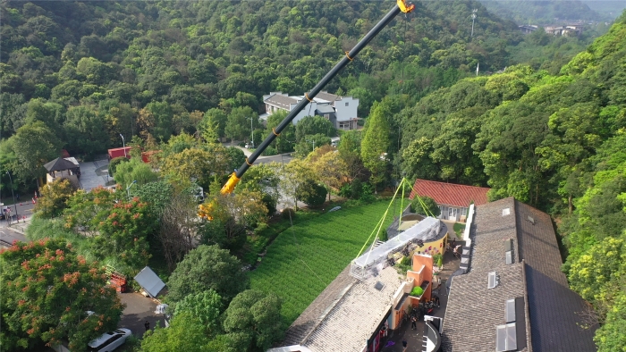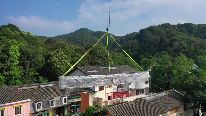 在杭州大清谷影视拍摄基地,一场“静默式”吊装正在上演。全球首款四桥八节臂130吨汽车起重机——XINGKONG SPORTG2代XCT130G8-1,将20米长、2.5吨重的剧组灯架稳稳送至跨度46米外的房屋上空。而这一“定格”,就是整整三天。