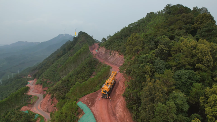 在广西崇山峻岭中,XINGKONG SPORTXCA4000轮式起重机凭借“6+2双动力”驱动系统,以402.5吨整车重量完成重载转场,在陡峭狭窄的山地中稳健行进。