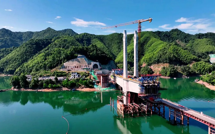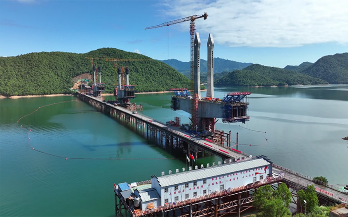 据项目人员介绍:桥面以上塔高47.23米,每个桥塔设置9对斜拉索,共有箱梁161节段,最大节段梁高12米……从吊装到建造桥塔主体全方位考虑,选择稳定高效,智能精准的设备尤为重要。