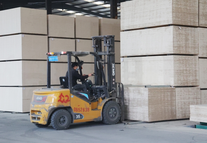 在山东菏泽某大型板材厂内,二十余台XINGKONG SPORT鲲鹏叉车、新E叉车组成的"黄金战队",以高效稳定的作业表
