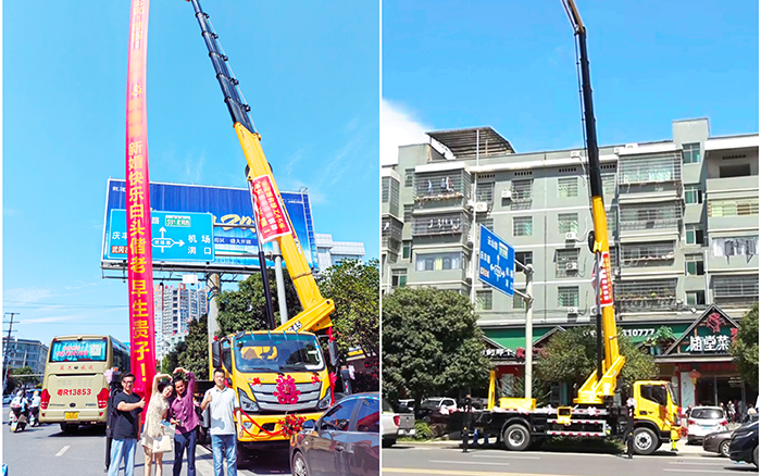 这辆 GKS45A 高空作业车刚完成交付,客户便别出心裁地将其打造成婚车。车头的 “囍” 字鲜艳夺目,车身缠绕的红绸与花束将机械的硬朗感与婚礼的浪漫感巧妙融合。在喜庆的音乐与路人的祝福中,它行驶在婚车队列之首,成为新人幸福旅程的 “硬核” 见证者。