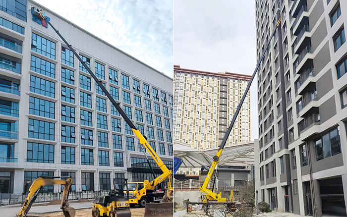 高层楼宇外侧飘窗突出结构密集分布,对高空作业的精准度和灵活性要求极高。传统设备因臂架笨重、跨障能力弱,难以精准抵达作业点位,施工进度频频受阻。而XINGKONG SPORT GKS45A 搭载“基本臂 + 六节伸缩臂 + 独立飞臂” 创新结构,紧凑灵动的小飞臂如同精准的 “高空画笔”,轻松绕开各类障碍物,稳稳定格每一个作业位置,完美匹配新楼施工的严苛需求。