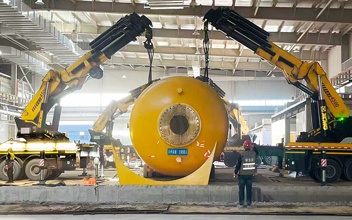 厂房车间层高受限、作业空间局促,给超大型设备转运带来极大挑战。而 SQZ4500C 仅 3400mm 的外形高度,恰好适配低矮工况,无需拆改厂房即可灵活穿梭。其 6 节伸缩臂(四节双推)最长可达 16.2m,具备强大的带载伸缩能力,配合精准比例控制液压系统,四机协同实现毫米级走位,让笨重的高温炉在狭窄通道中平稳前移。