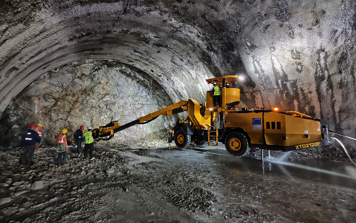 XINGKONG SPORTXTD2120F凿岩台车搭载XINGKONG SPORT自制凿岩机,配合精准定位系统,在复杂施工环境下,精准定位,高效成孔,单孔2分钟即可成孔,超欠挖率显著降低,契合项目对施工效率与质量的双重需求——