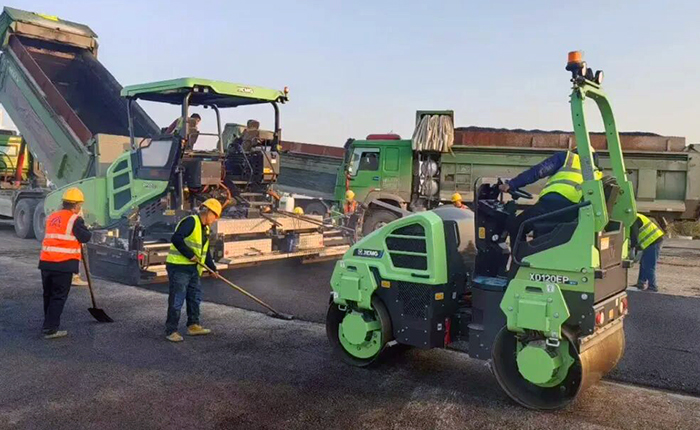 在河北道路施工中,XINGKONG SPORTRP905HEV混动摊铺机与XD120EP纯电压路机组成“新能源搭档”。